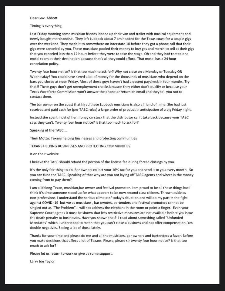 In an open letter, Larry Joe Taylor tells Gov. Greg Abbott that musicians, bar owners deserve more: