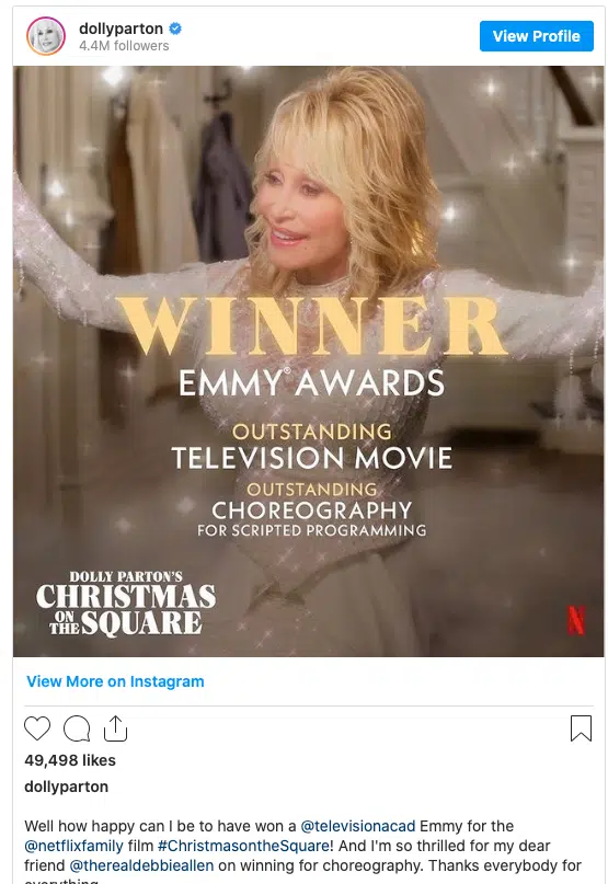 Dolly’s Netflix holiday film “Dolly Parton’s Christmas on the Square” was voted Outstanding Television Movie, with Dolly picking up a trophy as executive producer.