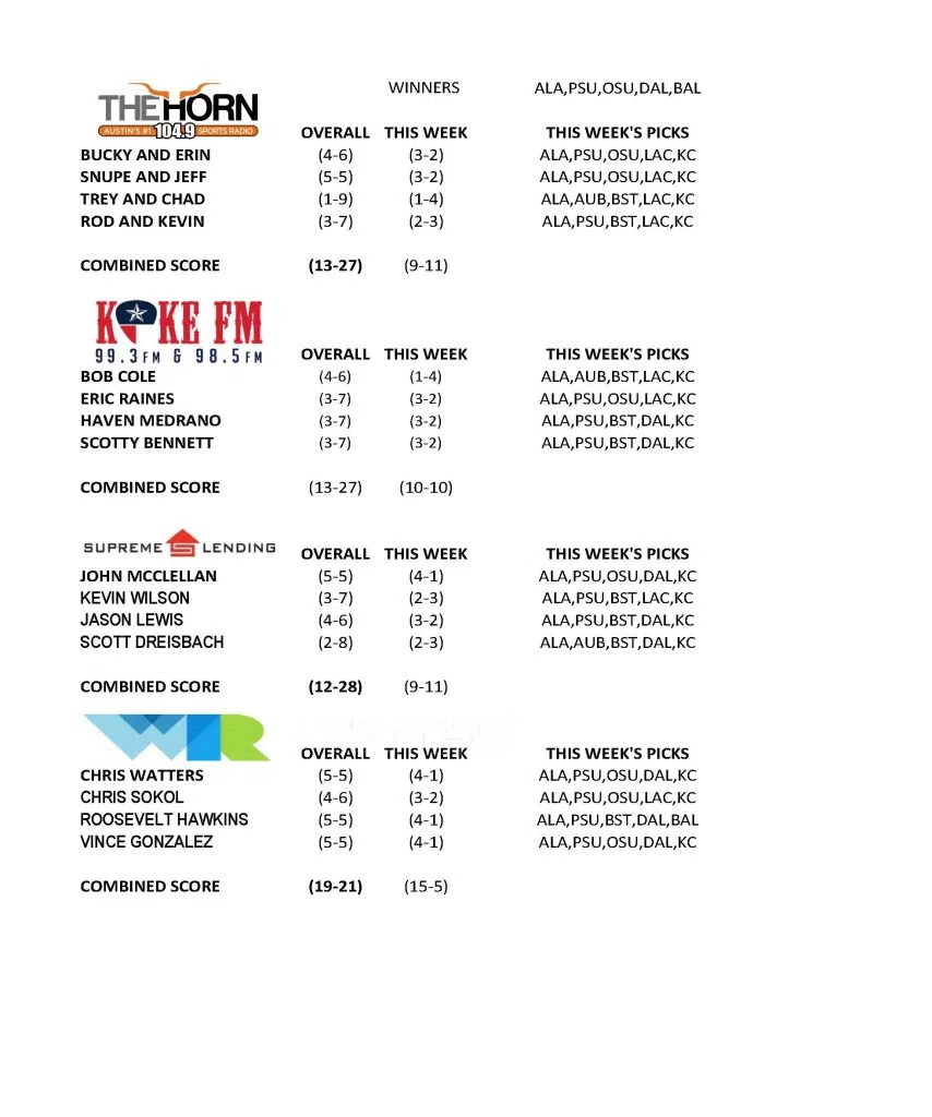 Each week, they will pick who they think will win from a list of six games. At the end of the season, the most wins will walk away with champion bragging rights and $5,000 for their charity!