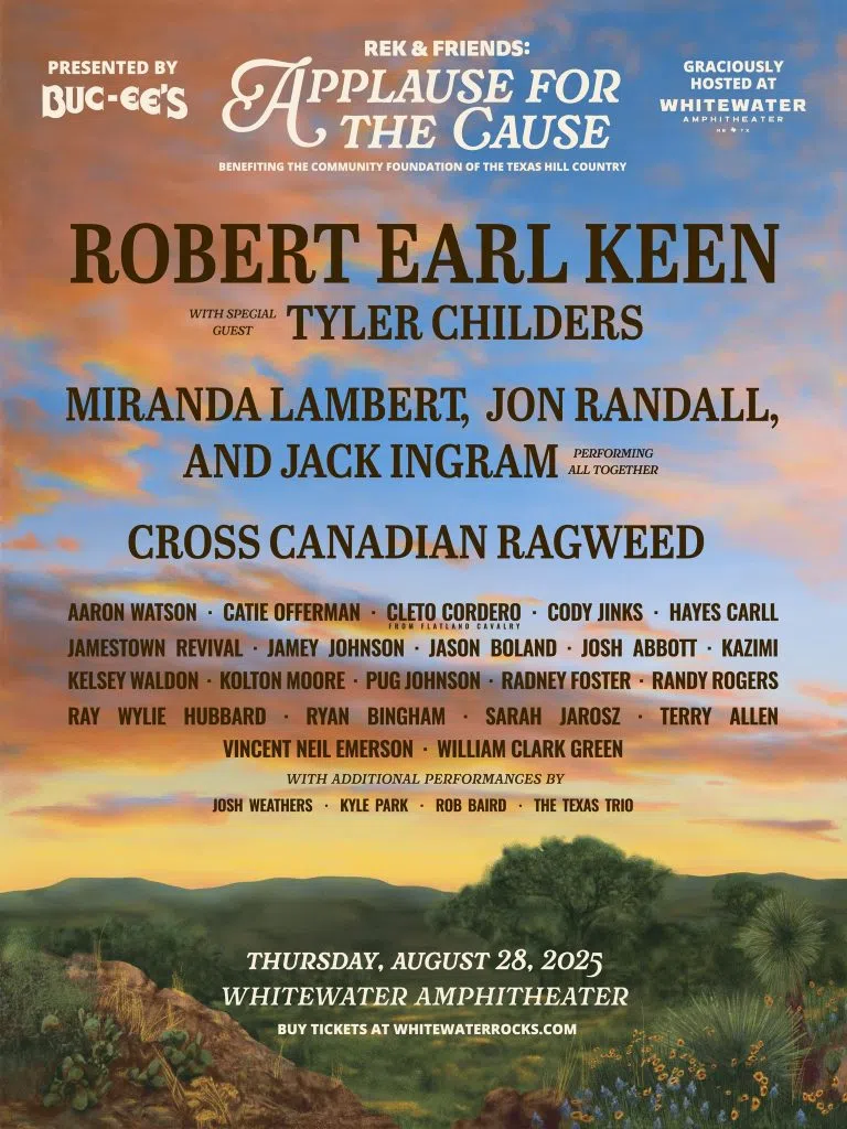 Applause for the Cause is made possible by generous support from Buc-ee’s, who have already pledged a one-million-dollar donation to the Community Foundation of the Texas Hill Country. Whitewater Amphitheater for hosting the event. As well as Veeps, Miller Pro AVL, C.C. Creations, illustrator Dorothy Nottingham.