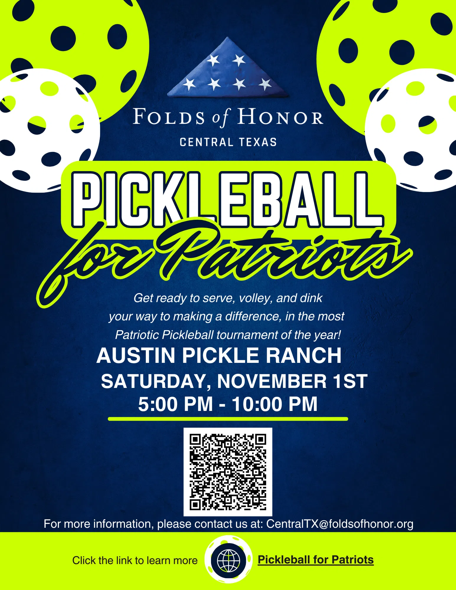 Mark your calendars for Friday, November 1st, 2025, because something brand new is coming to Central Texas! Folds of Honor – Central Texas is hosting the inaugural “Pickleball for Patriots” event at the Austin Pickle Ranch, and it’s shaping up to be an evening of fun, fellowship, and fundraising for a cause that truly matters.