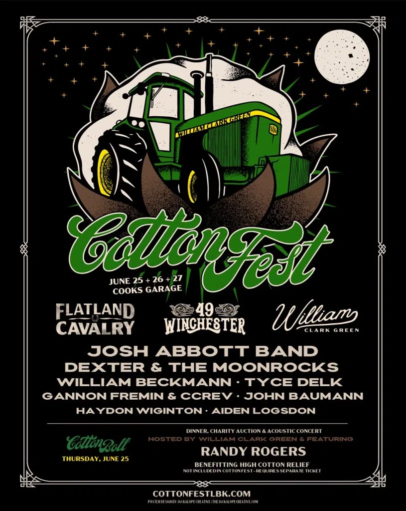 The festival runs June 25–27, 2026 at Cook’s Garage in Lubbock, with the main festival days on the 26th & 27th. The weekend kicks off with the Cotton Ball, a seated dinner, acoustic show, and auction hosted by William Clark Green with Randy Rogers in the mix. It’s for a great cause too, raising funds for High Cotton Relief, which helps West Texas cotton farmers.