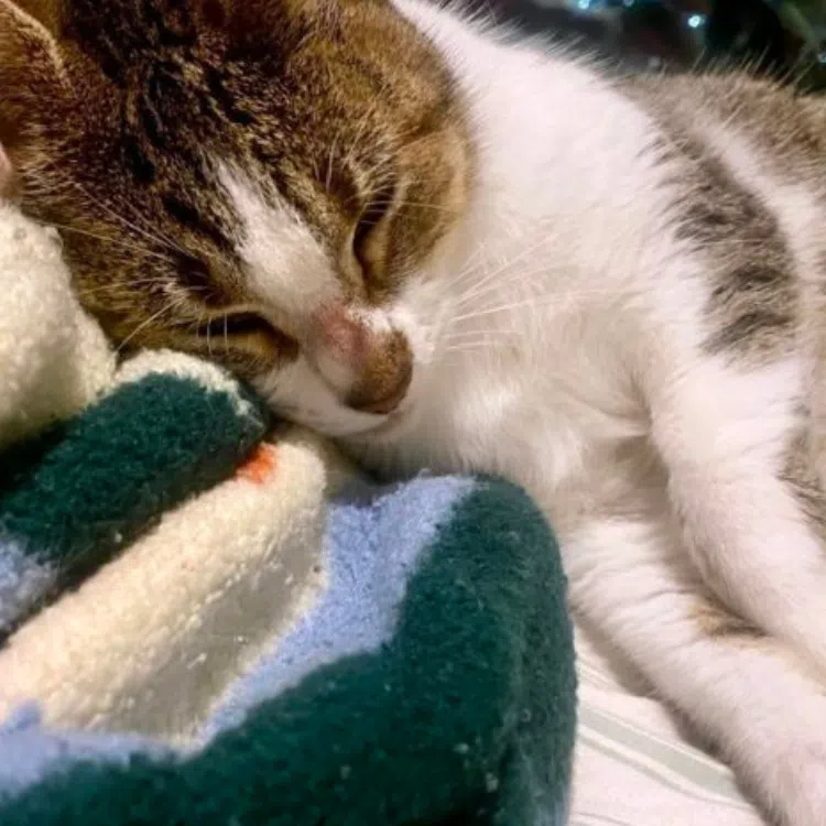 Penelope is a gentle soul who is learning that the world can be soft again. Nearly four years old and currently in foster, she is timid, shy, and careful, always taking a moment to observe before stepping forward. She is a beautiful tabby with warm brown and gray stripes, bright curious eyes, and a soft white chest and paws.