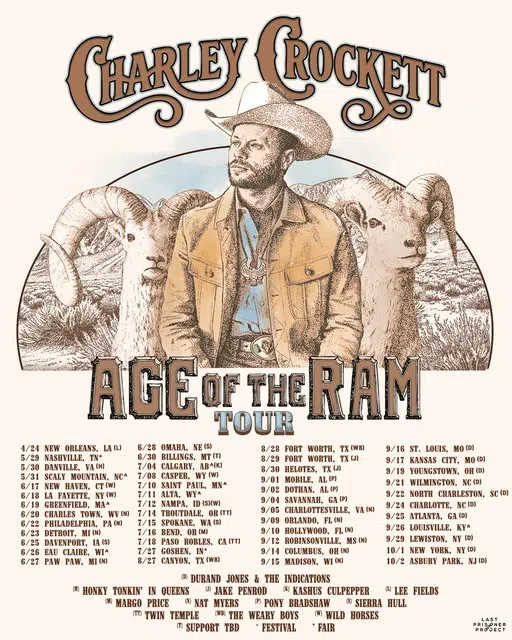 Charley Crockett has just announced his 2026 Age of the Ram Tour in support of his upcoming album Age of the Ram, out April 3. The extensive U.S. run kicks off in late April and stretches through earl...