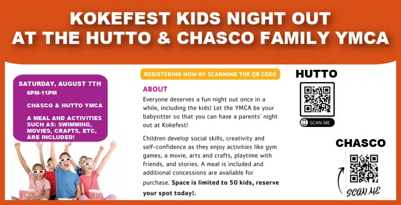 KOKEFEST is happening the weekend of August 6th and 7th! If you are a parent and want to make a night of it the YMCA has the answer! YMCA is offering childcare at the YMCA in Hutto and the CHASCO YMCA...