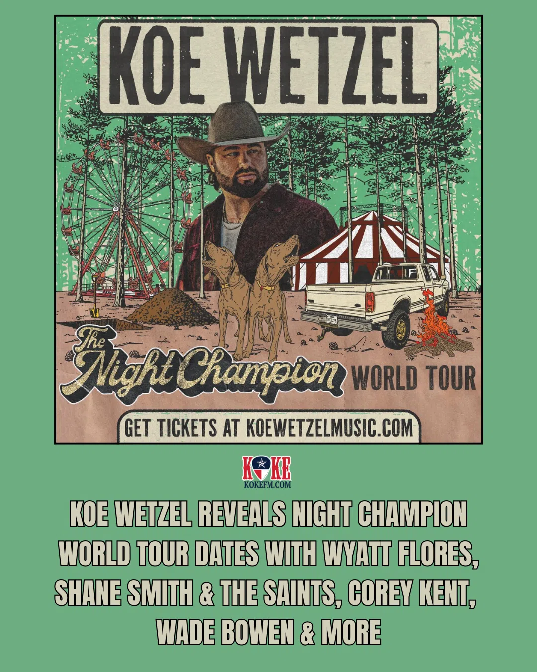 Koe Wetzel just dropped some massive news for 2026. He's officially announced The Night Champion World Tour, kicking off July 23 in Nampa, Idaho and winding its way through the U.S. before wrapping up...