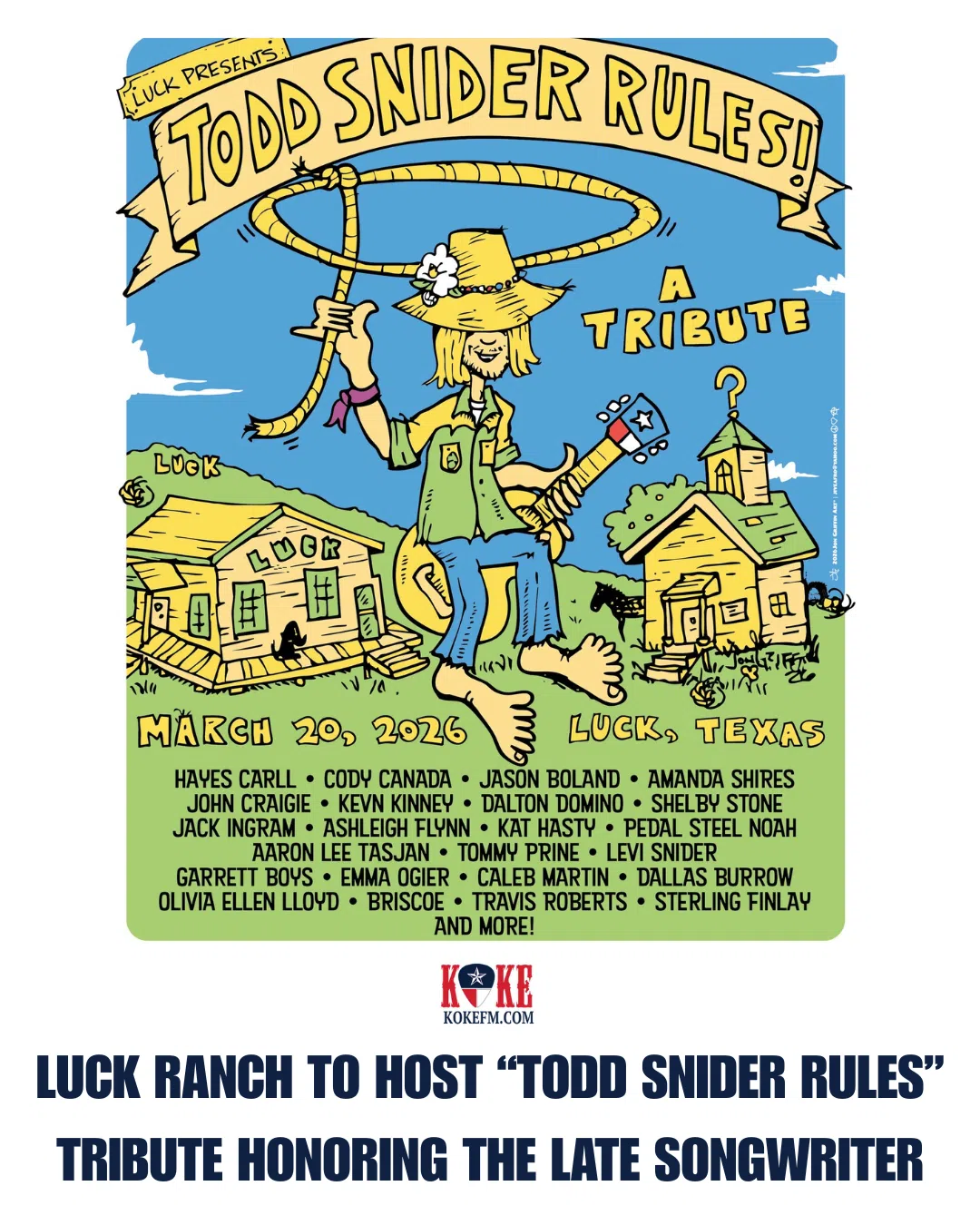 Luck Ranch in Spicewood will host a special tribute concert on March 20, 2026 honoring the life and legacy of the late Todd Snider. "Todd Snider Rules - A Tribute" will bring together an extensive lin...